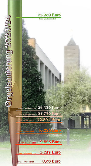 Unsere Spendenaktion für die Ausreinigung der Orgel in der Martin-Luther-Kirche ist wieder etwas vorangekommen. Bis heute (Oktober 2025) wurde uns der Betrag von rund 24.300 € gespendet. Wir freuen uns natürlich sehr darüber und sagen ganz herzlich Dankeschön. Leider ist der Weg bis zur endgültigen Finanzierung der Maßnahme (75.000.- €) noch recht weit. Daher an dieser Stelle nochmals die herzliche Bitte um Ihre Spende für unsere Orgel: